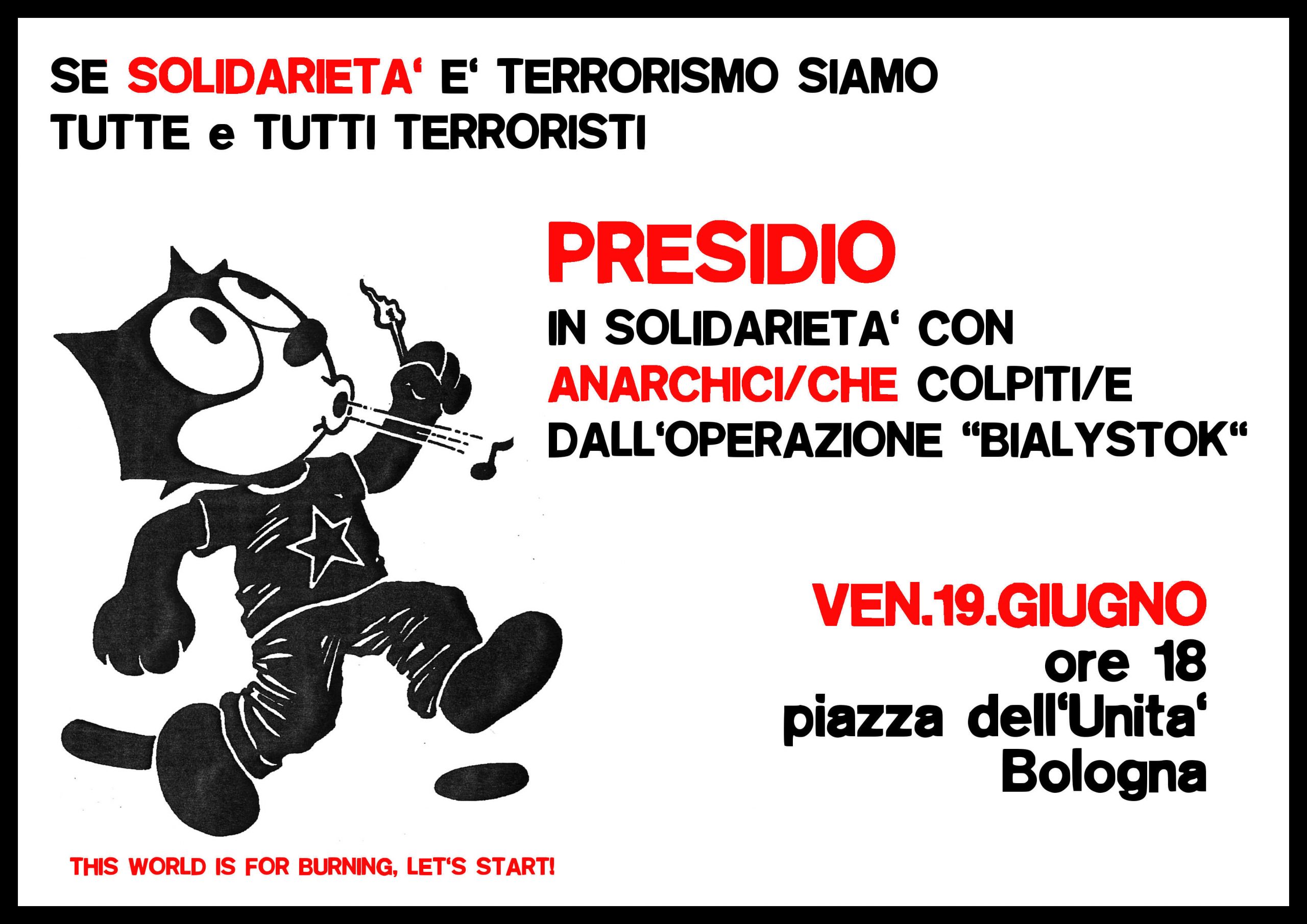 Come rete anticarceraria aderiamo al presidio in solidarietà con gli/le anarchici/che colpiti/e dall’operazione “Bialystok” venerdì 19 giugno alle 18 in Piazza dell’Unità a Bologna.