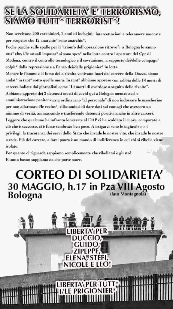 Di istituzioni totali tocca parlarne, oggi più che mai, gli anarchici lo hanno sempre fatto ma la procura ha voluto farci sapere che non conviene avvicinarsi e sostenere queste lotte, proprio per spezzare quella solidarietà che stava sostenendo le rivolte dei detenuti, mettendo in luce i pestaggi e il silenzio seguito a quei giorni, per chiedere indulto, amnistia e libertà per tutte e tutti.